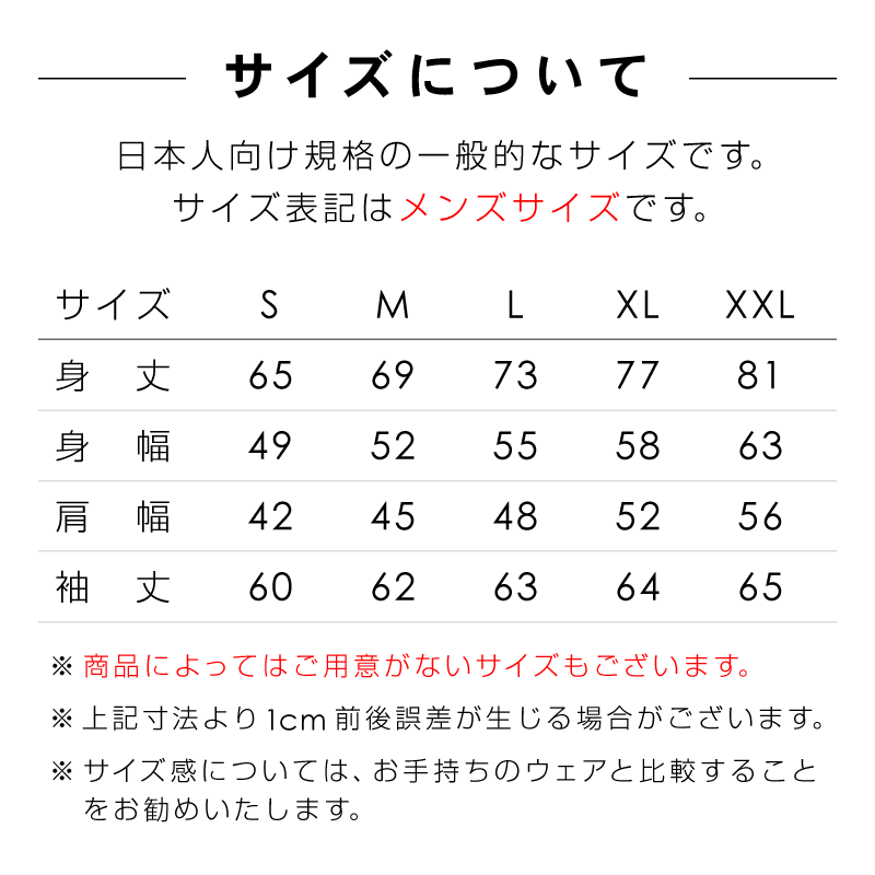 ※ 上記寸法より1cm前後誤差が生じる場合がございます。 ※ サイズ感については、お手持ちのウェアと比較することをお勧めいたします。
